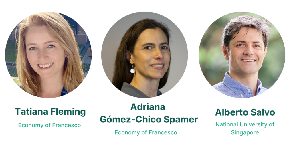 Nous étions accompagnés de trois intervenants aux perspectives complémentaires : Tatiana Fleming, économiste travaillant sur l’innovation verte et la transformation industrielle en Amérique latine ; Adriana Gómez-Chico Spamer, experte de l’économie sociale et solidaire, qui promeut des modèles réduisant les inégalités ; et Alberto Salvo, économiste de l’environnement qui étudie comment les comportements réels influencent les résultats climatiques. Ensemble, ils abordent des questions allant du technique — comme les technologies vertes, les marchés du travail et les systèmes économiques — jusqu’au profondément personnel, incluant la responsabilité morale, les habitudes quotidiennes et la conversion écologique.