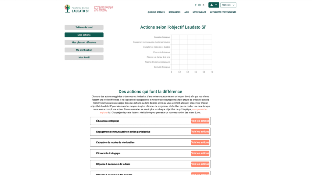 Après validation, votre progression se met à jour automatiquement. Un indicateur en haut de la page vous montre comment vos actions contribuent aux différents objectifs Laudato Si´.